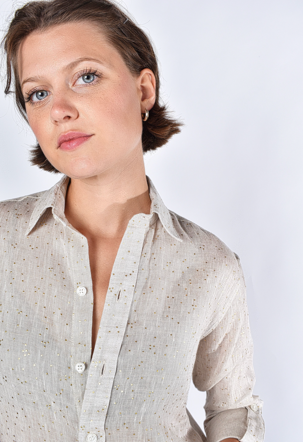 • Gold dots scattered across breathable linen fabric