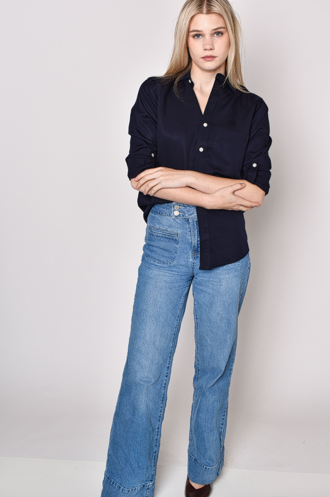 NAVY TENCEL GIRLFRIEND BUTTON DOWN SHIRT